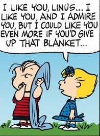 Like Linus, I believe in a blankie. Although I don’t carry mine around continuously as we see that wise-beyond-his-years “Peanuts” character does, still I have an emotional attachment to blankets that probably Linus alone can understand. “Happiness,” Linus once philosophized, “is a warm blanket.” Only the most heartless human being would argue with that belief. Or somebody like Sally, who was quick to tell Linus, “I like you, Linus, I like you, and I admire you, but I could like you even more if you’d give up that blanket.” Thank God he was smart enough to keep the blanket.