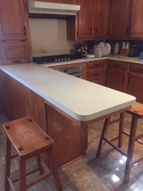 I spent a good part of my childhood at my grandma’s snack bar, a long, rectangular tabletop that my uncle had designed for her when he built her house in 1954, this bar separating the kitchen from the dining area. Instead of the table, my grandma and I always ate at her snack bar, where two high bar stools stood on opposite sides, her stool the green one on the west side, and my own bar stool, a similar one, on the east side. There was a third one–a yellow one–that was pushed against the north wall of the kitchen, used only if another person showed up.
