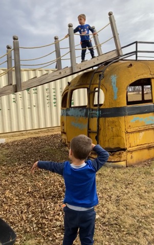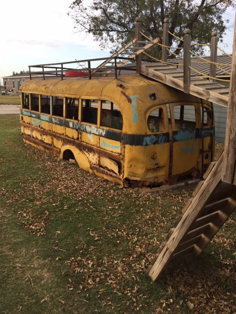 When Jake outgrew the bus, one of my sisters had her husband hitch the bus to a vehicle, dragging it–now that it had no wheels–down the road to her yard, where her granddaughter could make a playhouse out of it. However, once it was put in place, she had her husband dress it up, adding a pirate’s nest on the backside, a sandbox next to it, converting the whole area into a playground, with the old school bus the centerpiece, a stark contrast between the old and the new never more apparent.