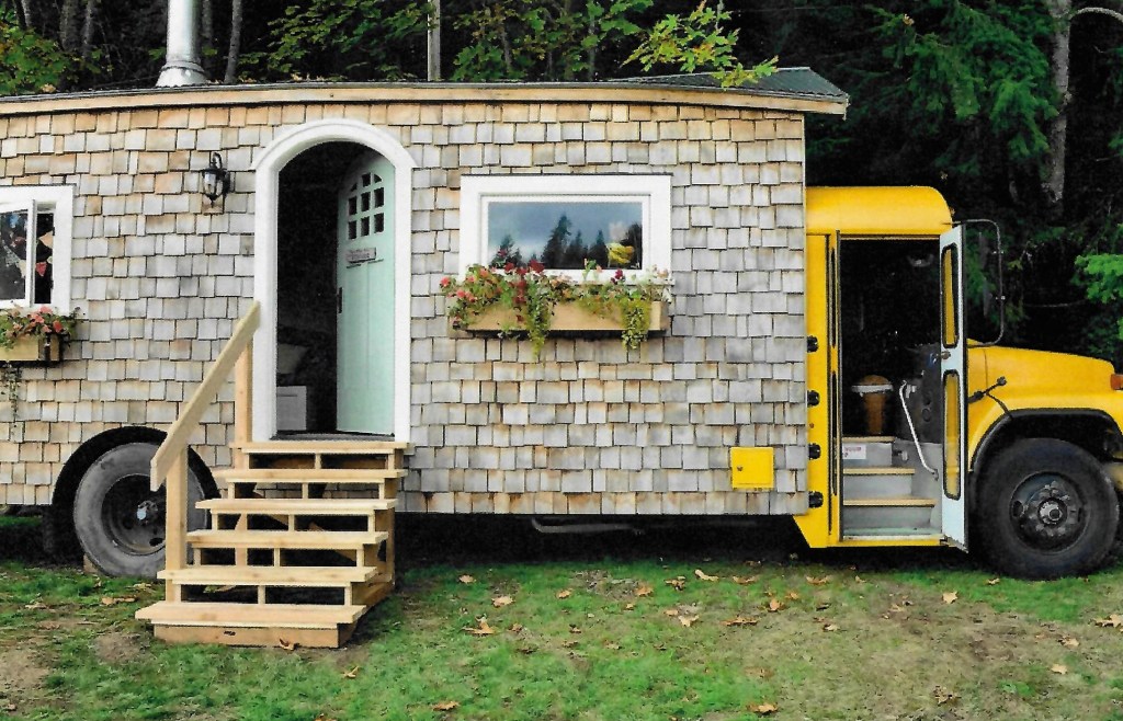 To my knowledge, I haven’t seen on the highways one of those little houses framed inside a school bus, not yet, but I can’t be certain. Like everybody else, I’ve met a lot of buses on the road and I suppose it would be difficult to know for sure, without getting inside the bus. Unlike a Trailways bus that digitally pops the destination on the front window, these don’t say, “I’m really a house, not a bus.”